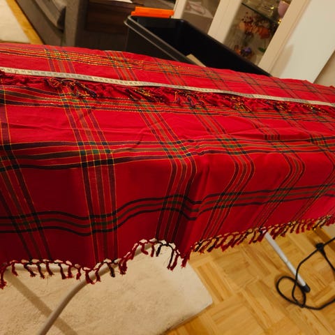 Upea, hyväkuntoinen jouluaiheinen kappaverho. Leveys 170 cm, kuvan rypytyksellä n. 120 cm. Korkeus 57 cm.