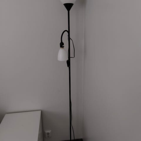 Retro lattiavalaisin, kork.130cm. Jalkaosa alkuperäinen ruskea ja valaisinosa on maalattu kullanväriseksi. Hammarin sähkössä on tehty uudet sähkötyöt, 37e. Kupu katkennut alkuperäisestä paikasta ja liitetty se uudelleen.