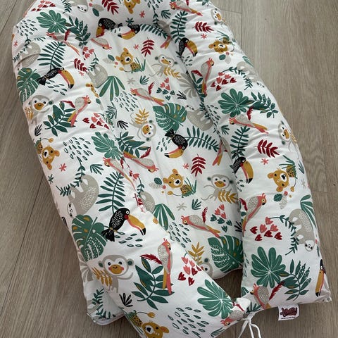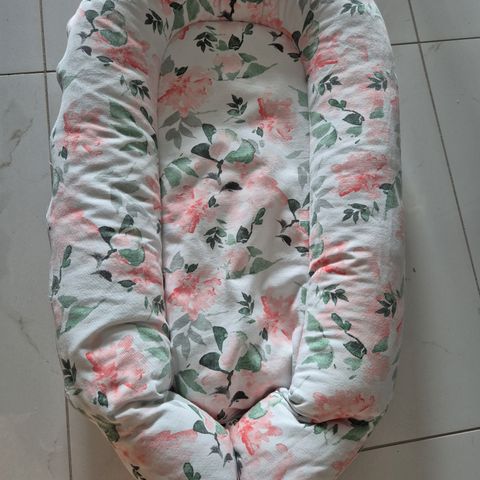 Yhdellä lapsella käytetty. Vähän nukkaa pinnassa (kuva). Muoto edelleen muhkea ja pysyy muodossaan. Saa pestä 40° koneessa. Väri: vaaleanharmaa sisältä ja tummanharmaa ulkoa.