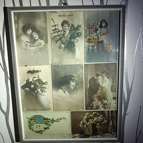 Vanhoista suomalaisista postimerkeistä Suomen kartan muotoon tehtyjä tauluja, uudet puukehykset 24,7 x 33,7 cm.