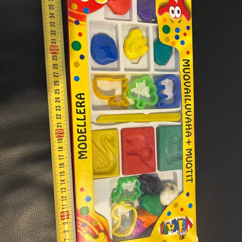10 purkkia muovailuvahaa ja Muna-lautapeli lapsille. Voi ostaa myös erikseen.