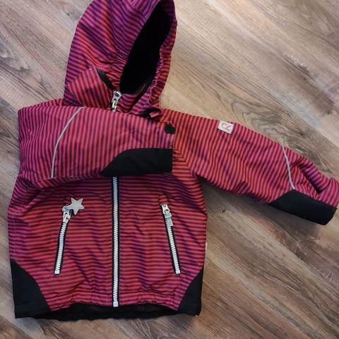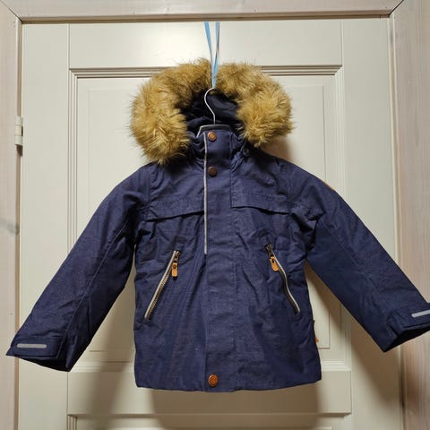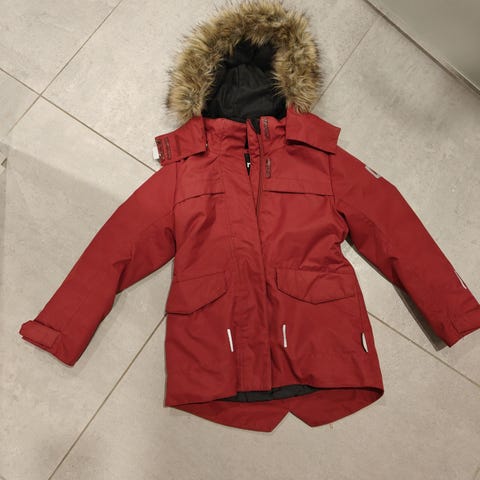 Talvitakki, kokoa 104, on hyvässä kunnossa, ei reikiä tai hankaumia, mutta helman materiaali on tummunut – tämän voi ehkä poistaa tahranpoistoaineella. Kalvo ei ole menettänyt ominaisuuksiaan; se on lämmin ja vedenpitävä. Ihanteellinen päiväkotiin; sopii märkään/mutaiseen säähän.