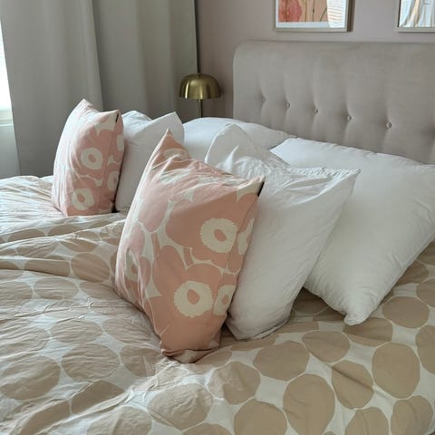 Uusi Marimekon kankaasta ommeltu koristetyynyn päällinen.
