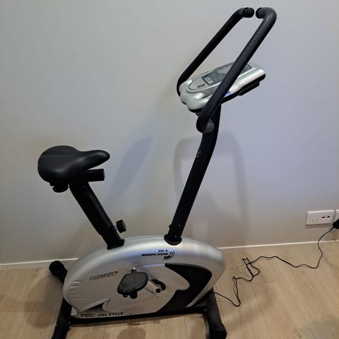 Kuntopyörä harmaalla ja mustalla värityksellä. Sisältää näyttölaitteen ja kahvat harjoittelua varten. Toimii sähköllä. Soveltuu kotikäyttöön kuntoliikuntaan.
