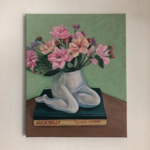Itse akryylimaaleilla 2cm maalauspohjalle maalattu lehmä kukkaseppeleellä. Koko 50 x 60.