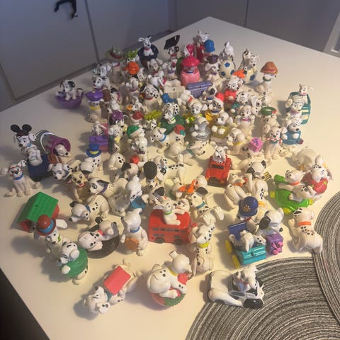 Aidot McDonalds 101 dalmatialaista figuurit 1990-luvulta. Viisi erilaista koirafiguuria ja piano. Hinta yhteensä 10 euroa sekä postituskulut.