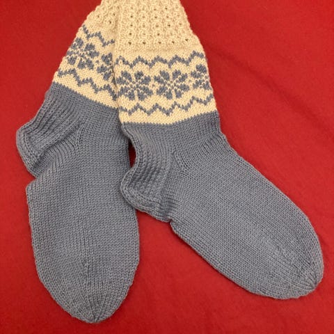Käsin neulotut villasukat, joissa on raidallinen kuvio. Sukat ovat harmaan, keltaisen ja valkoisen sävyisiä. Materiaalina villa 75 %, sopivat kylmien jalkojen lämmittämiseen, varsi näyttää kapealta, neulos on venyvää, pohja 25 cm, korkeus 22 cm, koko lienee 38.