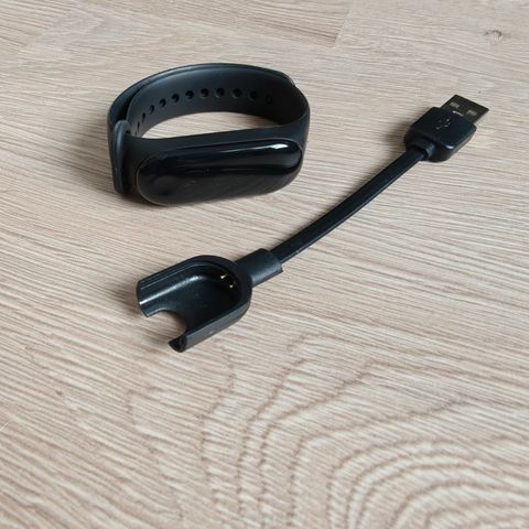 Mukana käytetty ranneke + latauskaapeli (kaapeli lataa hitaasti, mutta toimii).