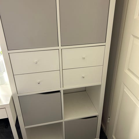 Myyntiin kuvien kaksi Ikea hyllykokonaisuutta ja Kuggis säilytyslaatikoita 16 kappaletta. Säilytyslaatikoidet mitat ovat 30x30x30cm, laatikoihin ei ole kansia. Laatikoiden yhdessä kantissa on pyöreä tarra (kännettynä kuvissa seinään päin). Siisti ja ehjä hyllykokonaisuus.