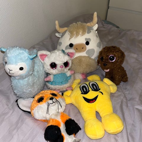 Yhden lapsen jäljiltä, mukana muutama uusi, merkkeinä mm. Ty ja Lumo. Isosta lehmäpehmosta avaimenperiin.