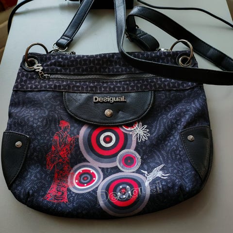 Kerran käytetty Desigual olkalaukku. Sisäosa kaksiosainen. L27cm, K21cm. Olkahihna