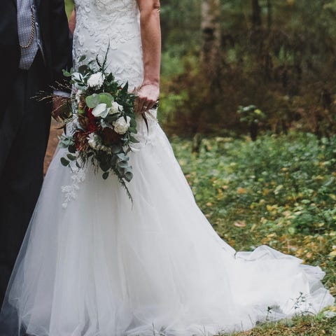 Hääpuku luonnonvalkoinen. Koko n. 40-42. Pesetetty. Mustat koristeet lisätty jälkeenpäin, pitäisi saada helposti irti, jos ei tykkää. Vetoketju. Sopii rintavahkolle.