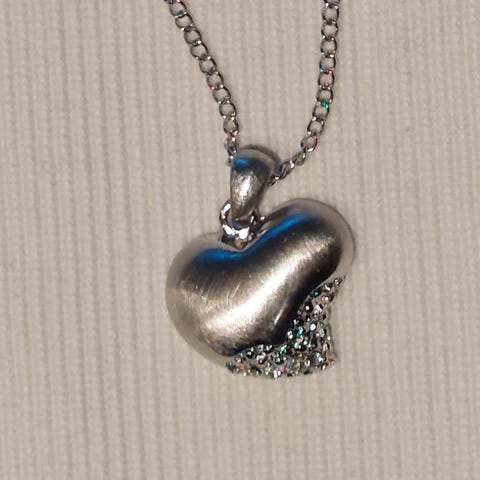Korumetallinen sydänkaulakoru,jossa koristekiviä sydämen alaosassa.