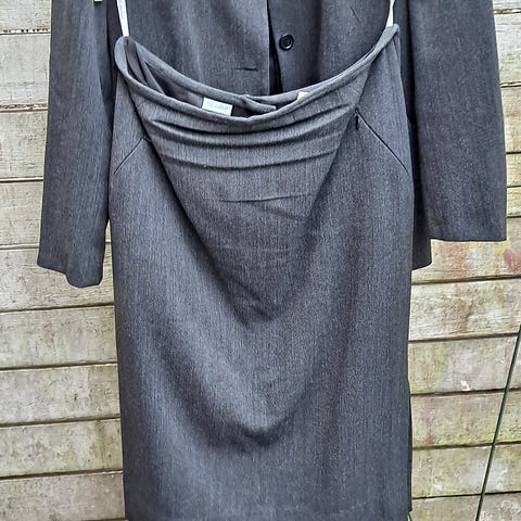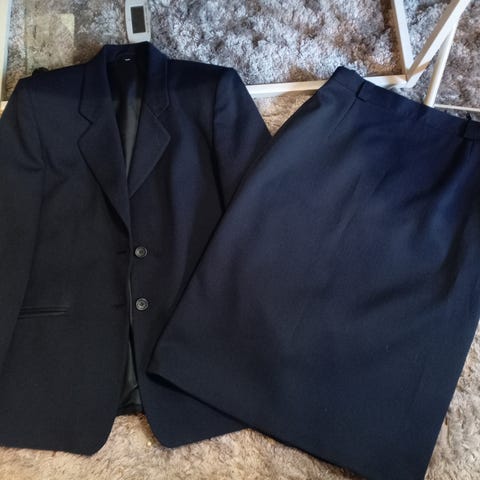 Laadukas Vihreä Jakkupuku, materiaali 65%polyesteria, 35%viskoosia, jossa Mekko ja Jakku, koko 44/46(katso mitat), molemmissa kevyt vuori, Takissa edessä napit, mitta kainalosta kainaloon 55cm edestä mitta, hihan mitta kainalosta hihan suuhun 44cm, mitta olalta helmaan 92cm.