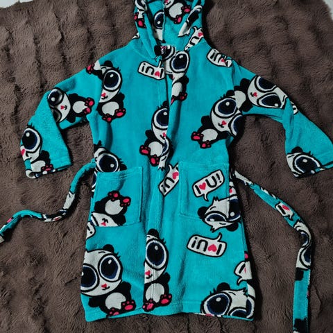 Kuvan pehmoinen ja lämmin fleece kylpytakki. Yhdellä tytöllä ollut käytössä. Siisti käytetty kunto. Edessä on pieni tahrapiste, muuten siisti ja hyväkuntoinen.