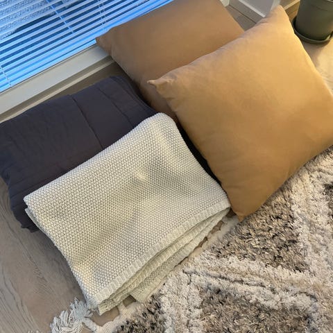 Kaikki päiväpeitteen päällä olevat sisustustekstiilit yhteishintaan. Koristetyynyn päällisiä, tilkkutöitä, verhoja, kaitaliinoja, tuolin pehmusteita jne.