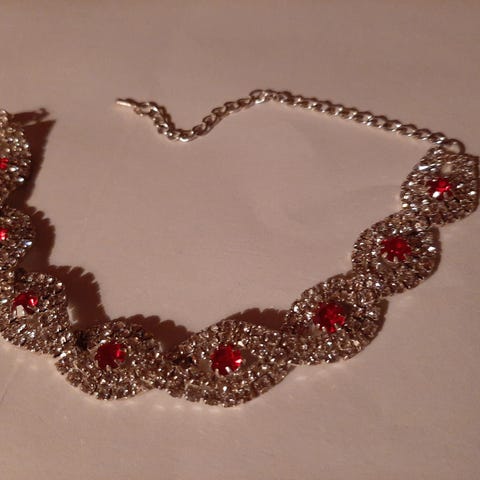 Rannekoru hopeanvärinen Rubiininpunaiset kivet ja kirkkaat kimaltelevat zirkonit jalokivijäljitelmää ympärysmitta 20 cm + jatko 2,5 cm leveys 10 mm rannekorussa on hyvä lukko, käyttämätön, korupussi tulee mukaan kulkeutuu sovittaessa lähialueelle + postitus yht 24 €