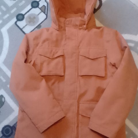 Ohut takki jossa on pilkku kuvioita. Takki on tummansininen. Koko on 134. Kaksi tyttöä keräävät rahaa vuokraponiin.