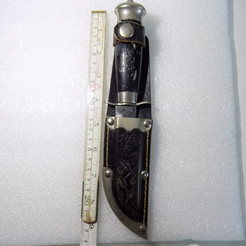 Veitsessä yhdistyy käsiteltävyys, ajaton muotoilu ja toiminnallisuus. Kahva laminoitua kovapuuta ja messinkiä. Tuppi vaaleaa nahkaa.