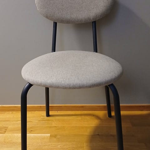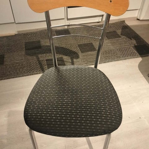 Tuoli, jossa on musta metallikehikko ja pyöreä puinen vähän kulunut istuinosa. Kuluma näkyy kuvissa. Kulumasta huolimatta päällysosa on sileä ja tuolia voi hyvin käyttää tällaisenaankin!