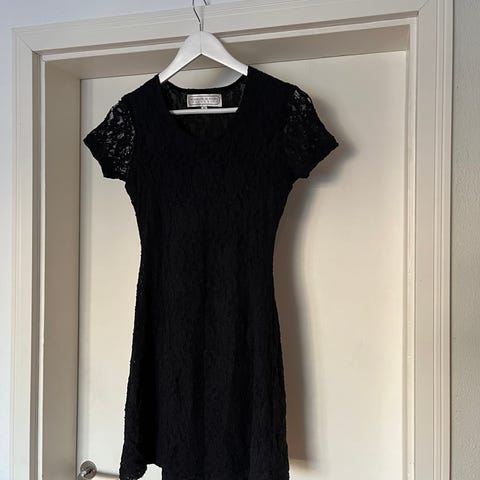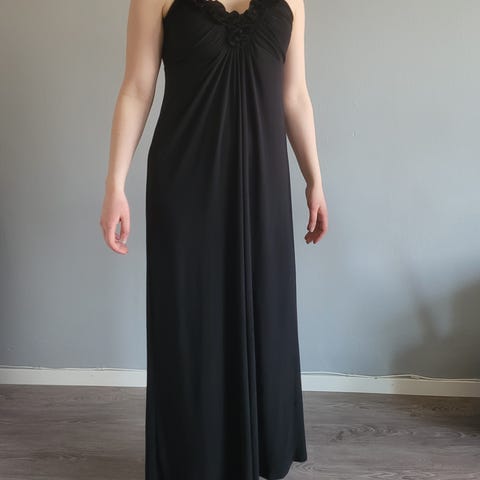 Musta juhlamekko, M/L, kainalosta kainaloon 51 cm, pituus 125 cm. Irrotettavat olkaimet. Samettinen yläosa.