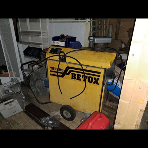 Polar Betox lämmityskone. Koneen tiedot jännite 220 V, polttoaineen kulutus 6,6l/h ja valmistaja Polarthem Oy Luvia.