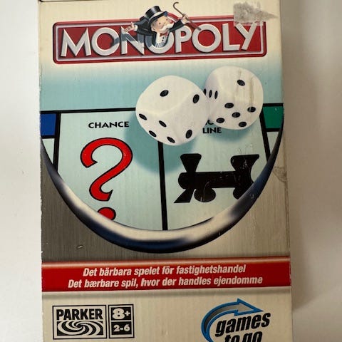 Monopoly Games To Go lautapeli perheille. Sisältää pelilautan, pelinappulat, pelikortit ja ohjeet. Sopii 8-vuotiaille ja sitä vanhemmille pelaajille, 2-4 pelaajalle.