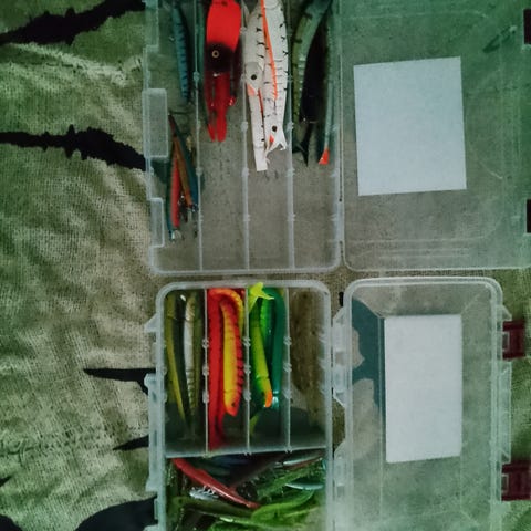 N. 20kpl vieheitä ja 8kpl jigejä, mitta, pihdit, kapula, sakset, siima, koho ja viehe pakki (2 tasoinen)