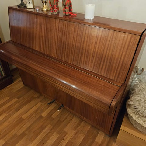 Puun värinen piano. Toimiva mutta virityksennvaatii. Alin kosketin on rikki.