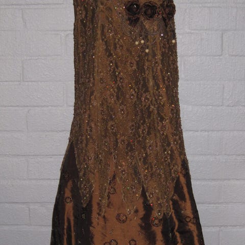 Ihana iltapuku, jossa nätti kiiltävähkö kullansävyinen/ vihertävä kangas.