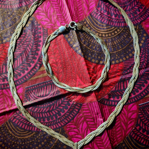 Kuvan mukainen hopeinen korusetti. Kaikissa osissa on “925”-leima. Kaulakorussa on vihreä jalokivi hopeaistutuksessa, pituus 42–45 cm, ja riipuksen pituus noin 4,5 cm. Rannekorun pituus on 18 cm, siitä puuttuu yksi kivi. Sormuksen koko on noin 17,5–18. Kunto on erittäin hyvä, ja kiilto on täyteläinen.