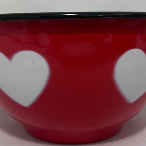 Punainen hyvässä kunnossa, emalipinta ehjä, siisti sisältä ja ulkoa. Korkeus 9 cm, halkaisija 10 cm. Made in Jugoslavia.