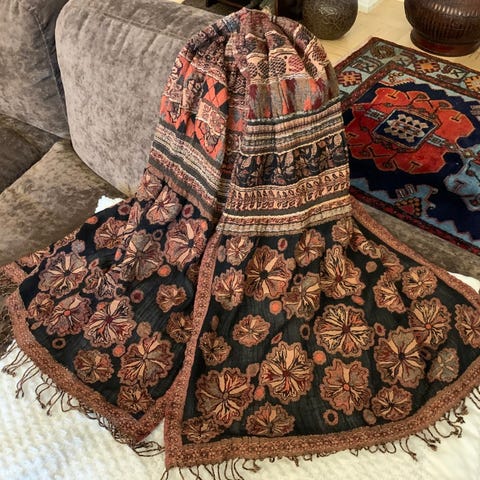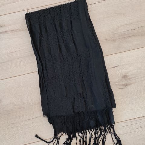 Musta/tummanruskea huivi, jossa luonnonvalkoisia ruusukuvioita. Huivi on laadukasta 100 % rayonia – materiaali tuntuu iholla erittäin pehmeältä ja laskeutuu kauniisti. Valmistettu Intiassa.