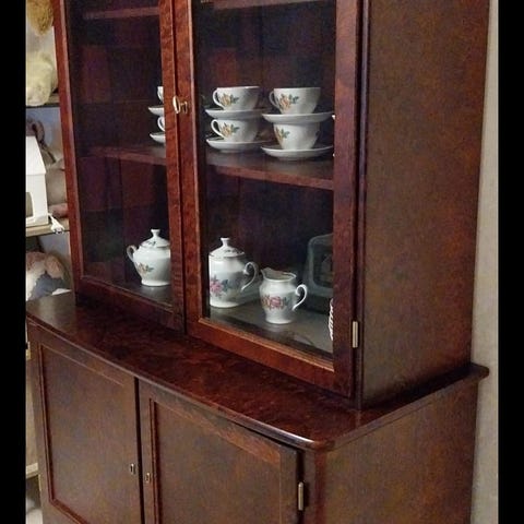Vanha vitriini, jossa on koristeelliset pylväät ja suuri peili. Alakaapin leveys on noin 140 cm, korkeus 71 cm ja syvyys 50 cm. Yläosan korkeus noin 88 cm. Liukulaseissa tähtikuviohionta, peilissä satavuotiaan kalusteen patinaa. Nouto Petäjävesi.