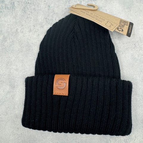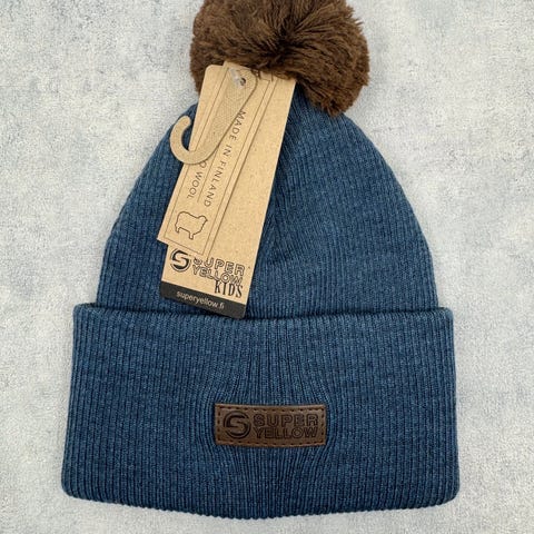 Tummanharmaa merinovillasetti pipo tupsulla ja kauluri, koko noin 3-5 vuotias. Lanka Schachenmayr merino extrafine 120, kestää varovaisen 40 asteen pesun ilman linkousta yms.