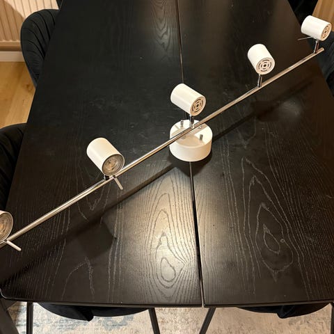 Kattovalo jossa kaksi spottia. Spotit saa käänneltyä monella eri tavalla. 2kpl GU10 Max 35w lamppua tarvitaan.