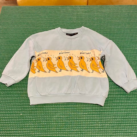 Mini rodini collegepaita, koko 104/110. Vähän haalistunut, printti siisti.
