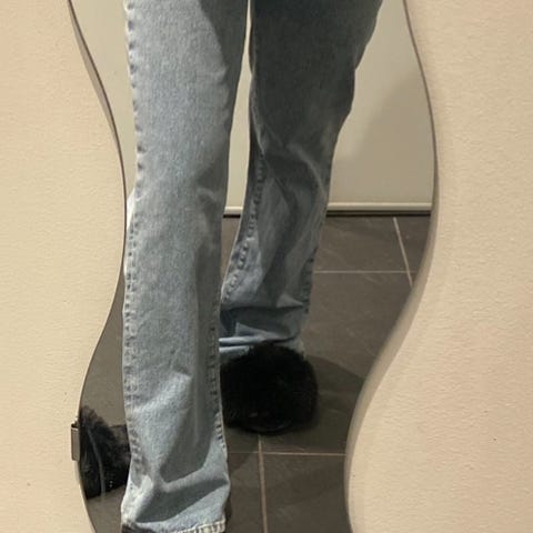 Denim vaaleansiniset korkeavyötäröiset leveälahkeiset farkut W 26" L 32" kokoa XS. Vintage tyyliä,- henkiset.