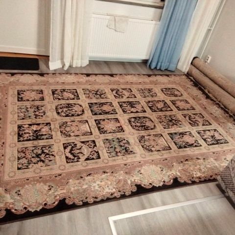 Kaunis puolikuun muotoinen matto, ns. 3D persialaistyylinen ruusukuviolla. Pehmeä ja paksu pinta, hapsut reunoissa. Sopii hyvin sängyn tai sohvan eteen tai eteiseen. Hyvä kunto ei tahroja.