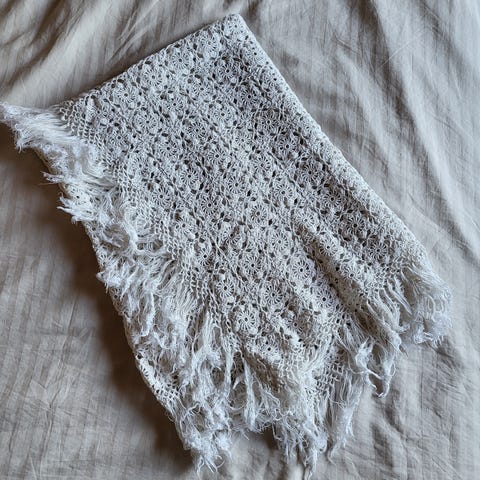 Vaalea virkattu kaunis peitto. Mitattu lattialla.
