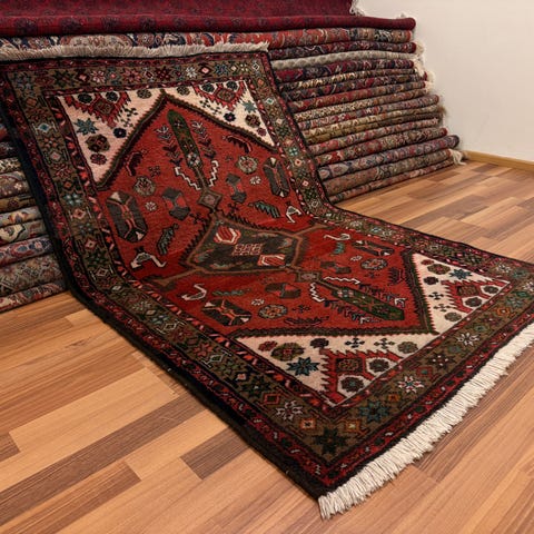 Käsinsolmittu persialainen Hamadan-matto. Se on käytetty ja hyvin vanha matto. Kuten kuvista näkyy, siinä on hieman kulumaa, mutta se on silti erittäin kaunis. Matto on noin 70 vuotta vanha ja todellinen antiikkinen Hamadan-matto. Ikä tuo siihen luonnollista patinaa ja aitoa, alkuperäistä ilmettä. Arvokas matto niin kokoelmiin kuin käyttöönkin.