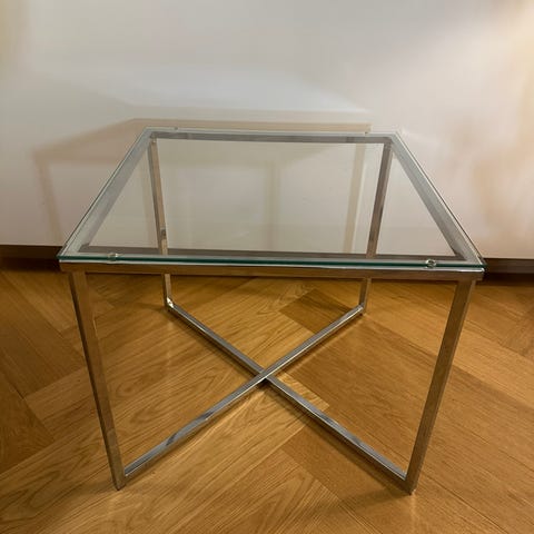 Kaksi puista pientä pöytää jossa lasi päällä ja hyllytila alla. Toisen kyljessä muutama naarmu.