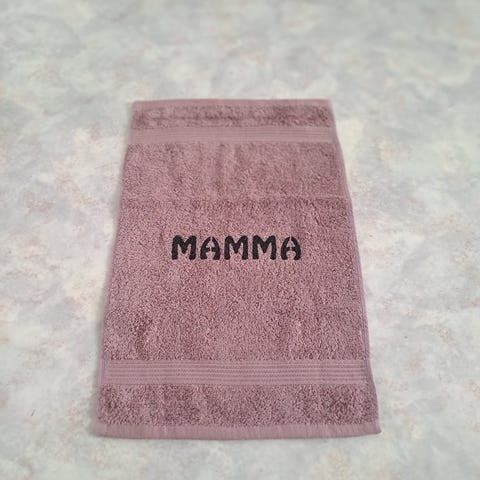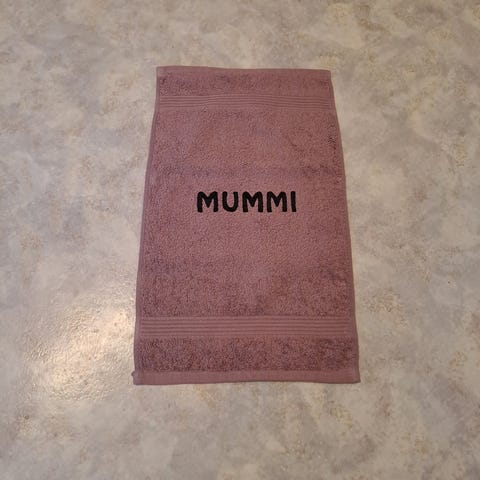 Uusi luumun lila 30x50cm pyyhe, johon käsinpainettu mummu teksti.