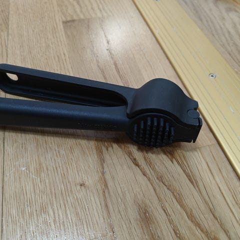 Hyväkuntoinen valkosipulipuristin, ostettu Prismasta 9,5 eurolla. Toimii hyvin, helppo puhdistaa.