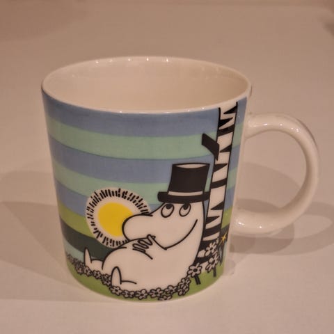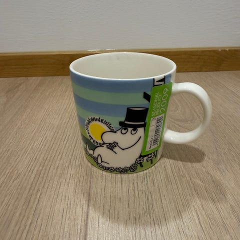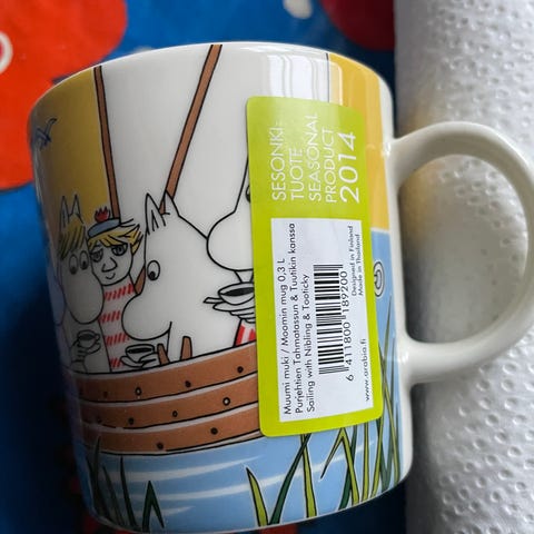 Muumimuki vuodelta 2009, kesämuki. Pöljänä irrotin tuolloin tarrat, vaan eivät nämä ole ikänä käytössä olleet. Tarran jämät vielä kyljessä.