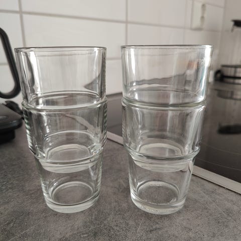 Merkittömät retrojuomalasit vuosikymmenten takaa. Paksua kestävää lasia. Oikeanpuolimmainen väriltään enemmän musta kuin sininen. Kirkkaiden korkeus n. 9 cm, tummat n. 7 cm.