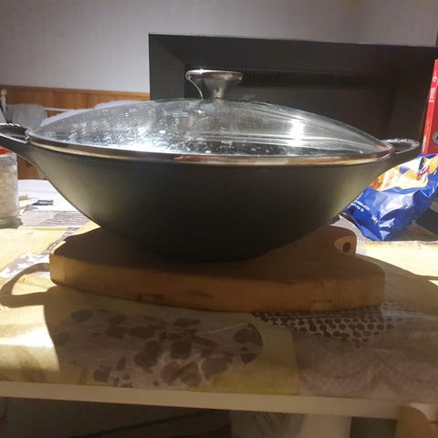 Punainen Le Creuset wokkipannu, jossa on lasikansi. Muutaman kerran kokeiltu. Vain nouto tikkurilasta tai mikkelistä.