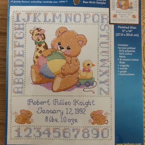 Myytävänä kuvassa oleva ristipistopakkaus lapsen syntymämuistotaulu.
