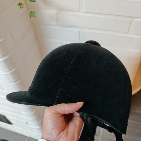 Myydään siisti, musta samettipintainen ratsastuskypärä koossa 57–58 (S). Klassinen malli, jossa pehmeä samettipinta, punainen sisävuori ja säädettävät remmit leuan alle. Kypärä on ollut käytössä, mutta yleisilmeeltään siisti – hyvä peruskypärä.