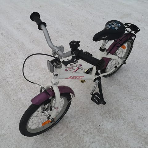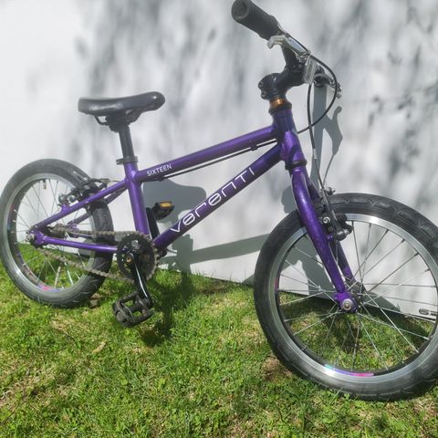 Hyväkuntoinen 1-vaihteinen lasten pyörä. Alumiinirunko. Jalkajarru takarenkaalle, vannejarru eturenkaalle. Etukori. Renkaat 16".
